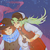 Description: Blair and N from Pokemon in stylized renditions of their canon outfits, holding hands against the backdrop of a nebula.